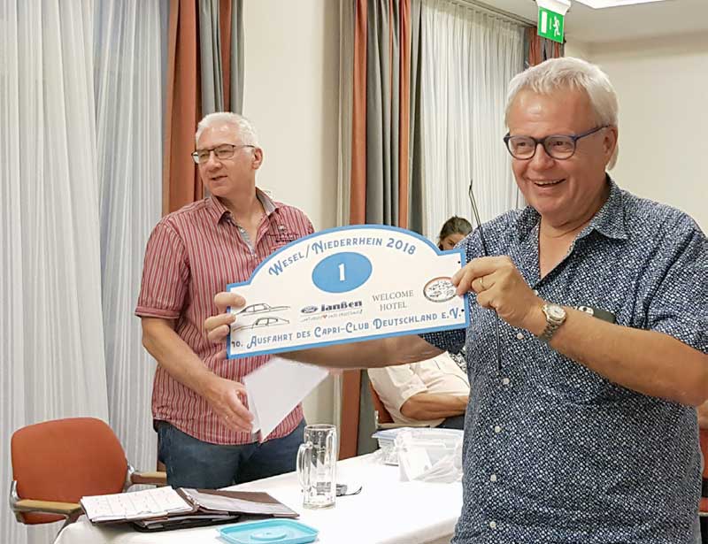 Nachdem wir uns beim Abendessen gestärkt hatten, kürten wir die diesjährigen Sieger. Steffi und Eberhard Gerber, die bisher an allen Ausfahrten des CCD teilgenommen haben, waren aber leider nicht unter den Gewinnern. Stattdessen belegten Steffi und Mario Dernst den dritten Platz. Michaela und Stefan Bäumer fuhren auf den zweiten Rang. Elke Hermanowicz und Heinz Arndt sind die Gewinner der Ausfahrt 2018.