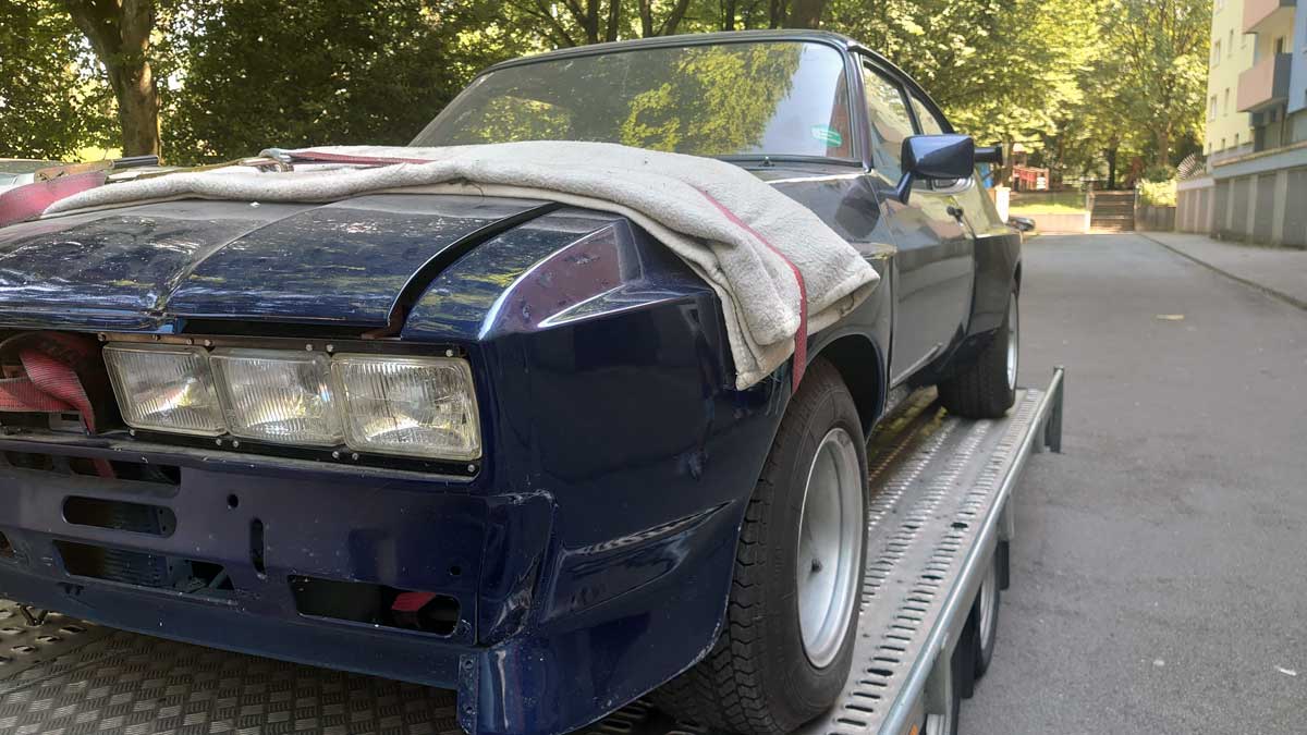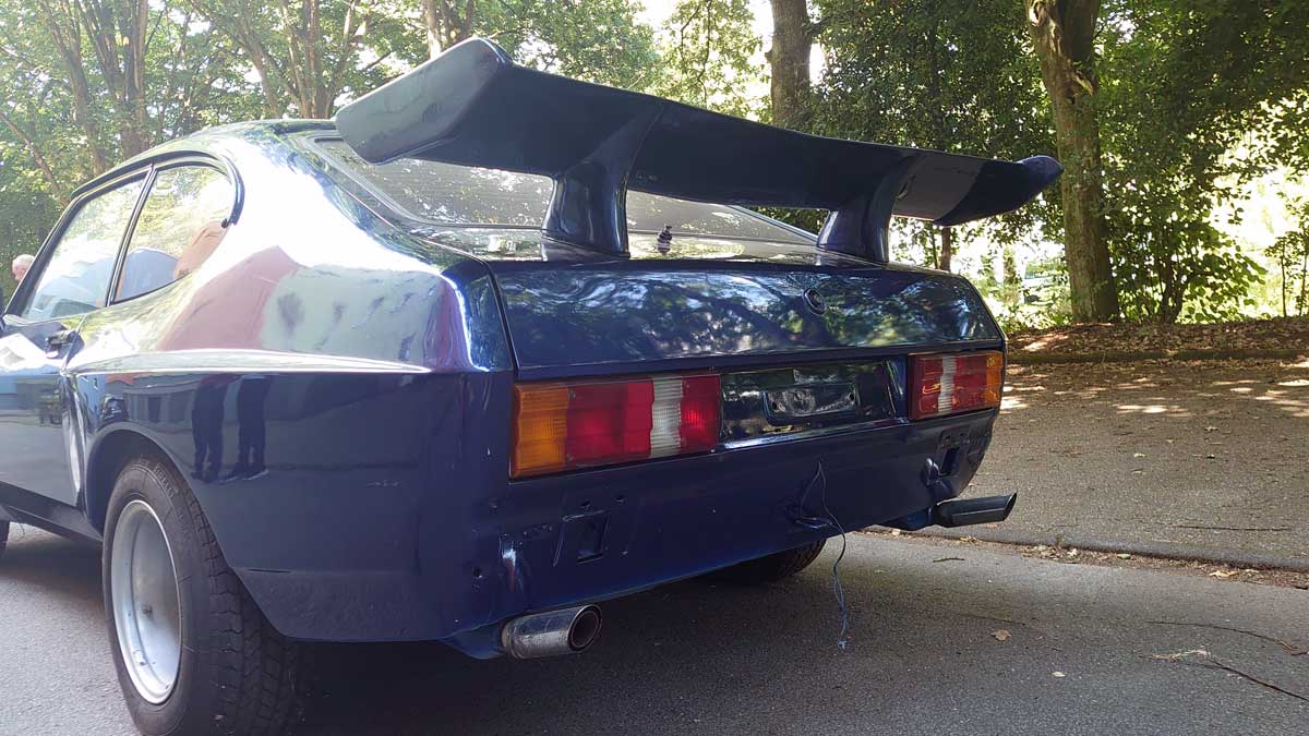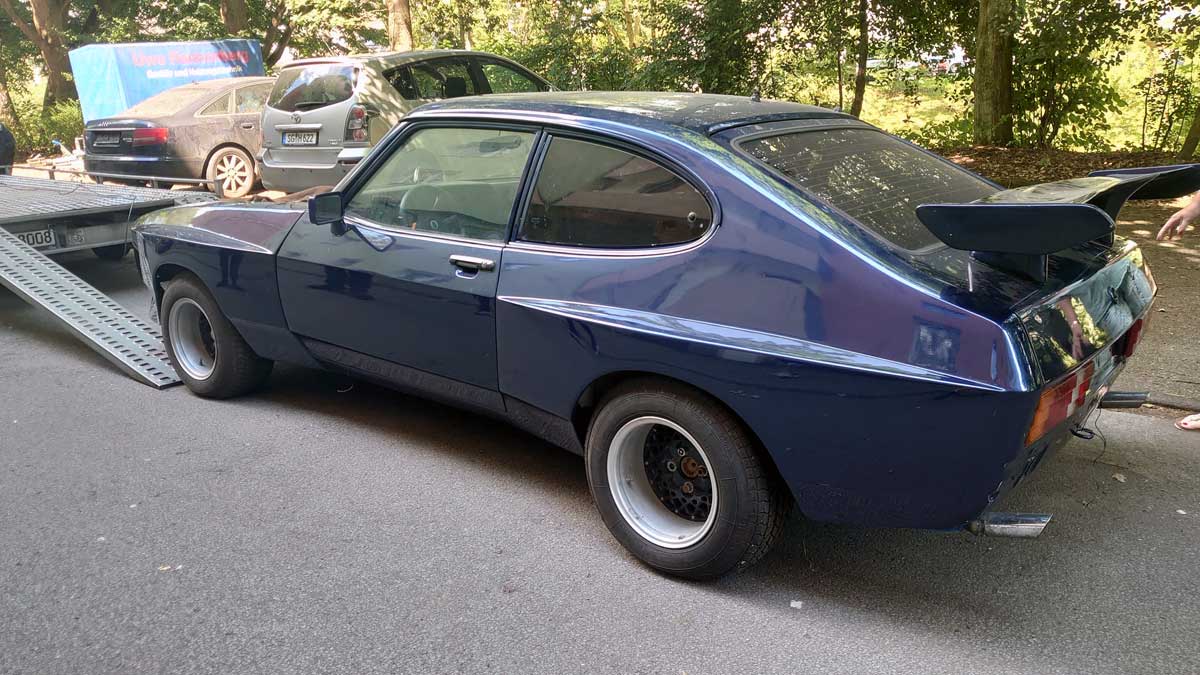 „Ich habe 26 Jahre meinen geliebten Capri III 2,8L Turbo May gehütet. Es handelt sich hierbei um ein stark individualisiertes Unikat (Eigenbaueintrag). Die Farbe ist der BMW-Farbton `Mauritius Blau Metallic´, das Auto steht auf dreiteiligen BBS-Felgen.