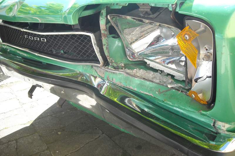 Scheinwerfer, Blinker und ein neuer Kühler können von einem auf alte Ford-Teile spezialisiertem Händler namens Motomobil geliefert werden. Der Plastik-Grill nicht. Bei Ebay entdecke ich ein Exemplar in einem beklagenswerten Zustand. Es fehlt die äußere Alublende, zig Farbanstreiche vermocken das wabenähnliche Gitter. Nützt nix, es muss halt improvisiert werden. Das Teil wird vorsichtig mit Trockeneis vom unschönen Anstrich befreit, die Alublende des zerstörten Grills hat leicht vermackt überlebt. Die friemel ich auf das „neue Altteil“. Makellos ist sie nach Unfall und Umbau nicht mehr, aber Alternativen sind gerade Fehlanzeige. Ein Makel ist auch, dass das Glas des neuen Blinkers ein dunkleres Gelb zeigt, als der unzerstörte Kollege von der Beifahrerseite. Geht gar nicht – glücklicherweise besitze ich noch ein Exemplar in meinem Teilelager. Vom Staub der Jahrzehnte befreit, zeigt es das „richtige“ Gelb. Wie hätte das sonst ausgesehen?