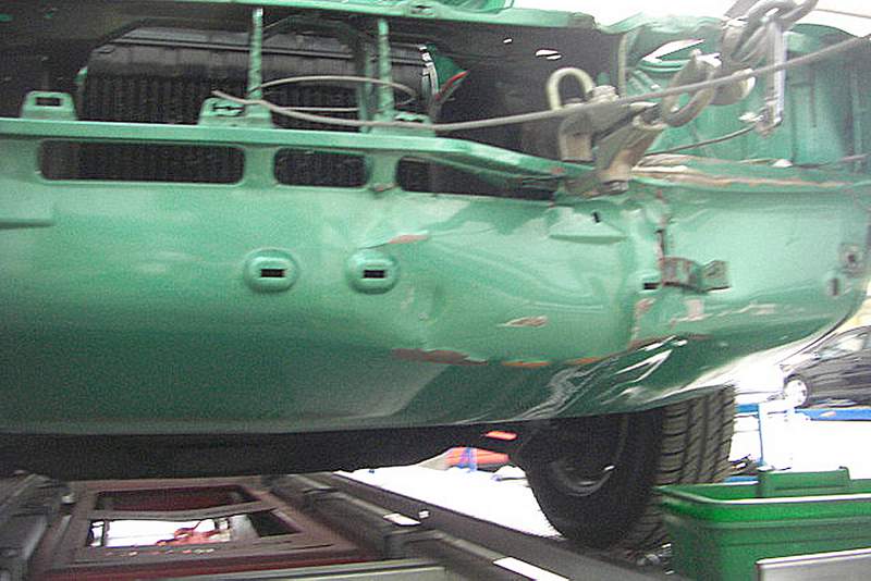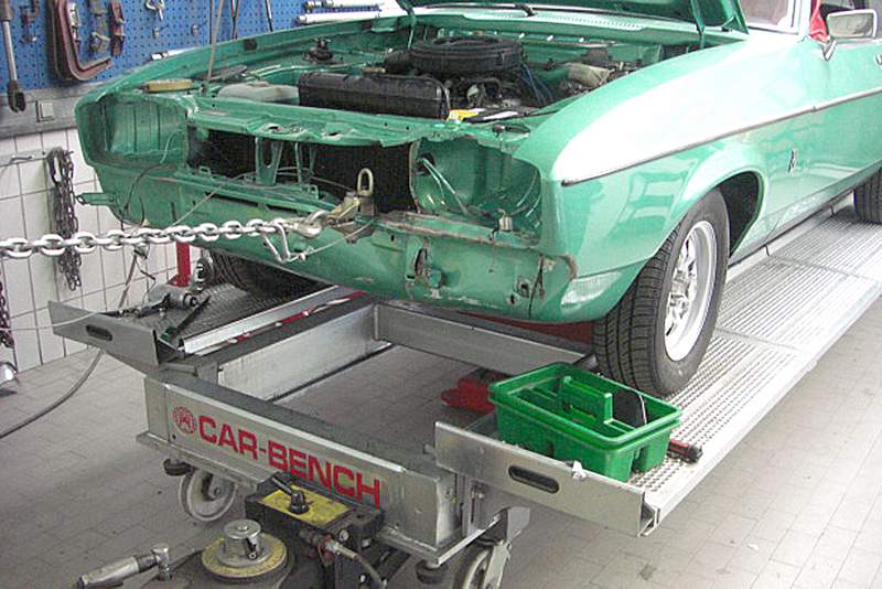 Zum Wiederaufbau wünscht sich der Karosseriebauer unter anderem eine neue Frontschürze, sowie eine neue Stoßstange. Ein Wunsch, der sich in diesem Moment schlicht nicht erfüllen lässt. Anfragen in Köln zu diesem Thema sind erfahrungsgemäß völlig sinnlos. Wer einen alten Ford fährt, fährt nur mit dem Flankenschutz eines Clubs wie dem CCD einigermaßen sorgenfrei. Unser Capri-Club Deutschland kniet sich bekanntlich seit vielen Jahren sehr in die Aufgabe, benötigte Teile neu anfertigen zu lassen. Doch bei einer Chromstoßstange mit Gummileiste und diesem Blech ist auch hier Ende im Gelände. Der Spengler hat es bereits geahnt und verfrachtet den Patienten auf die Richtbank. Gaaaanz behutsam, Zentimeter für Zentimeter, und über drei Wochen hinweg wird die fächerartig verformte Schürze wieder zurecht gezogen. Das geschieht so nebenher, andernfalls würde der Kostenrahmen noch zusätzlich klar gesprengt. Außerdem werden Schlossbrücke, Haube und Flügel wieder in in ihre ursprüngliche Form zurückgebracht.