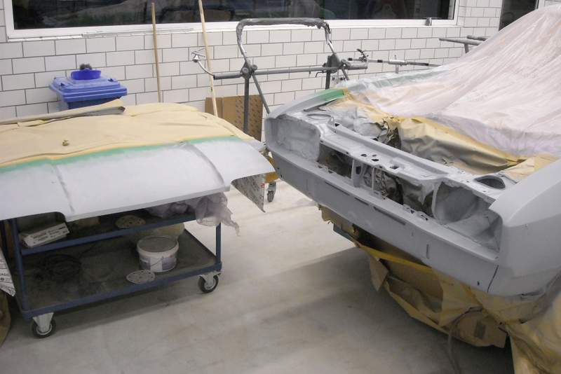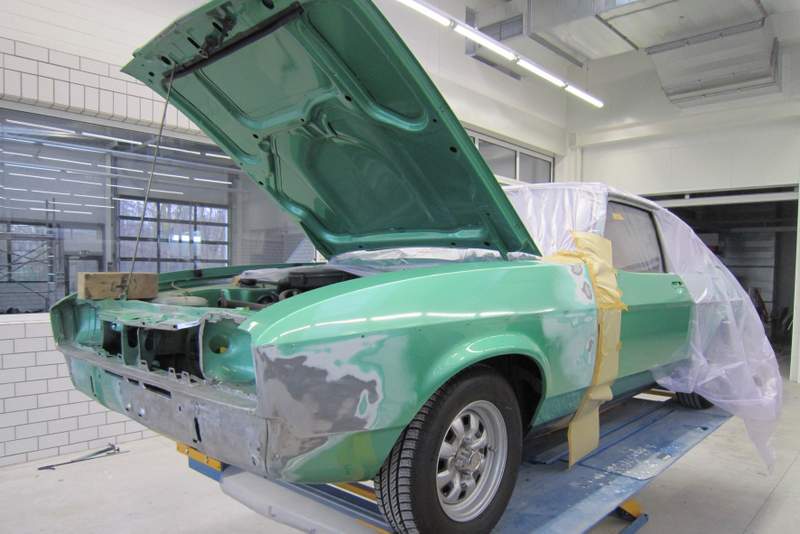 Sehr weitgehend im Originallack hatte sich der Capri vor dem Unfall präsentiert, damit ist es nun vorbei. „Mediterrangrün-Metallic 75“ war der Name seines Kleides. In der Lackiererei sorgt der Name trotz seines Wohlklangs für wenig heitere Mienen. Ein knappes Dutzend Lackkarten werden gespritzt, die Abweichungen zur Farbe aus dem Jahre 1976 sind teilweise beträchtlich, stets nicht zu tolerieren.
