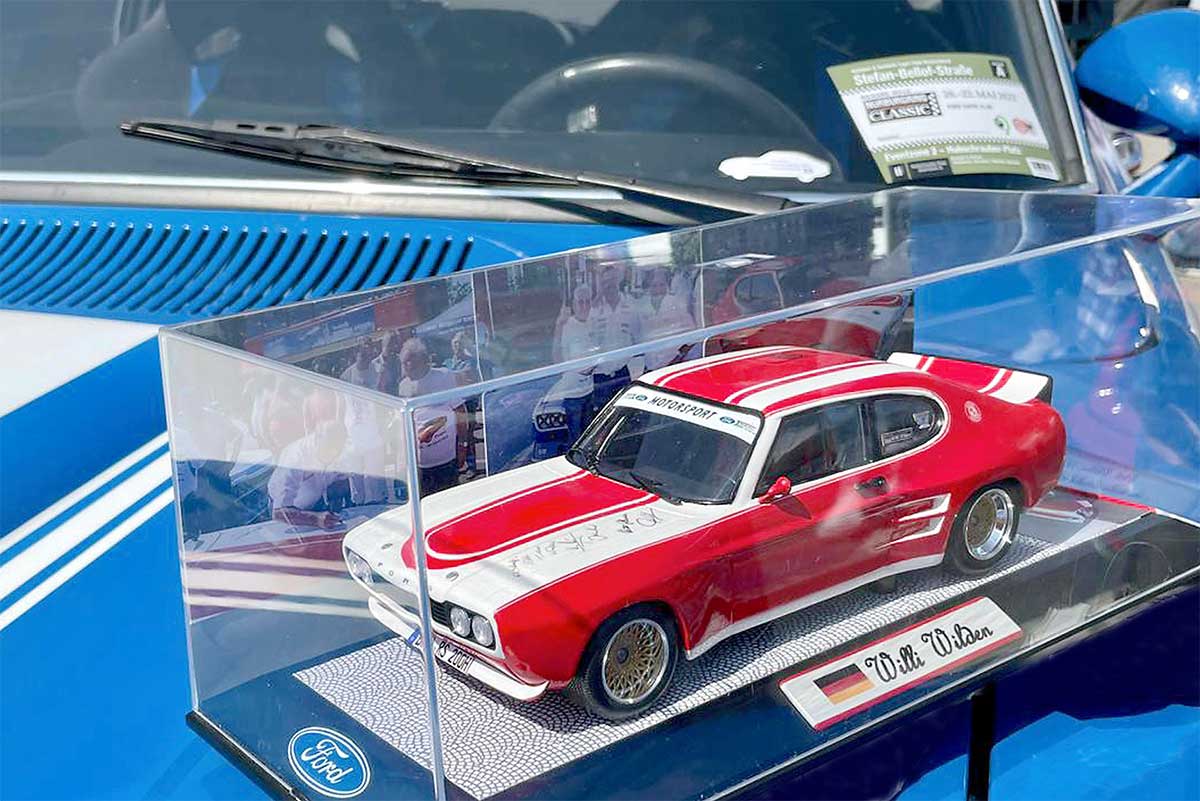 Zu diesem Zweck wurde Willi ins Fahrerlager gelockt, wo sich unter anderem unser berühmter Capri-Kollege Roland Asch mit seinem Team auf die Renneinsätze im Rahmen der Nürburgring Classic vorbereitete. Das einstige Rennsport-Ass Asch war bereits zuvor eingeweiht worden. Dort angekommen hielt Peter Bauke eine kleine Ansprache und ich konnte Willi dann seinen Capri als detailgetreues Modell überreichen.