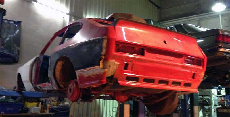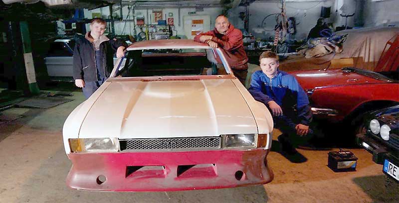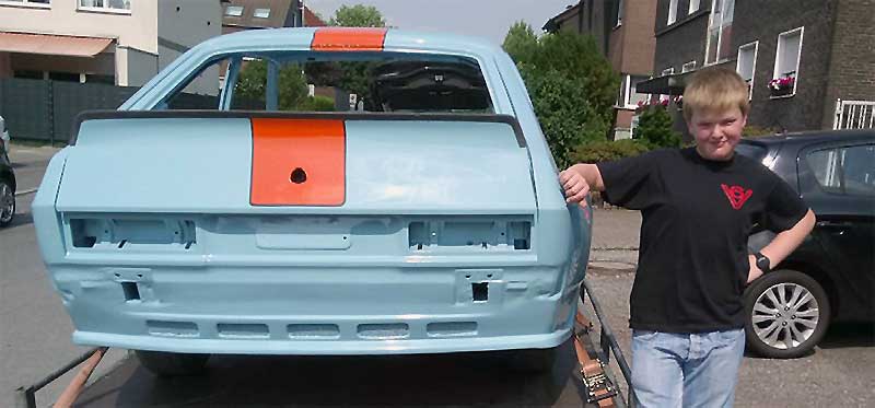 So blieb das Fahrzeug noch einige Jahre stehen, bis sich 2015 eine neue Situation ergab. Der bereits erwähnte Robin Stier baute sich gerade mit Vater Holger in der clubeigenen Halle seinen Capri auf. Der kleinere Bruder Leon stand dabei eher etwas unschlüssig herum. Dirk hatte gerade mit den Arbeiten an seinem „Ersten“ begonnen und eine Vision. In Anlehnung an sein Traumauto sollte der II-er nun optisch an den legendären Ford GT 40 in der Gulf-Optik erinnern.