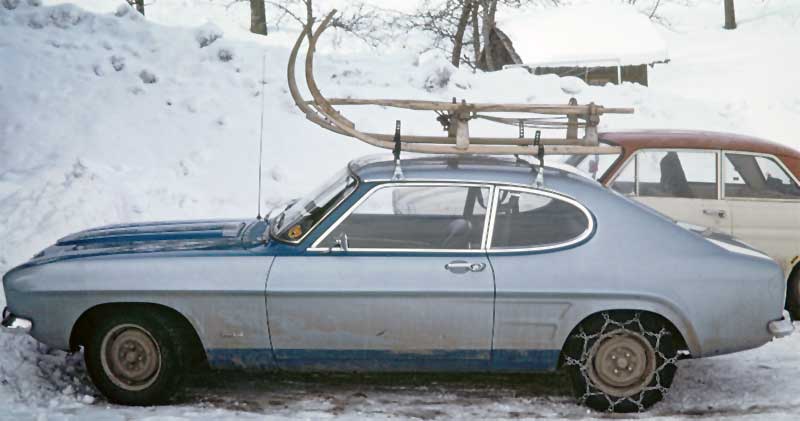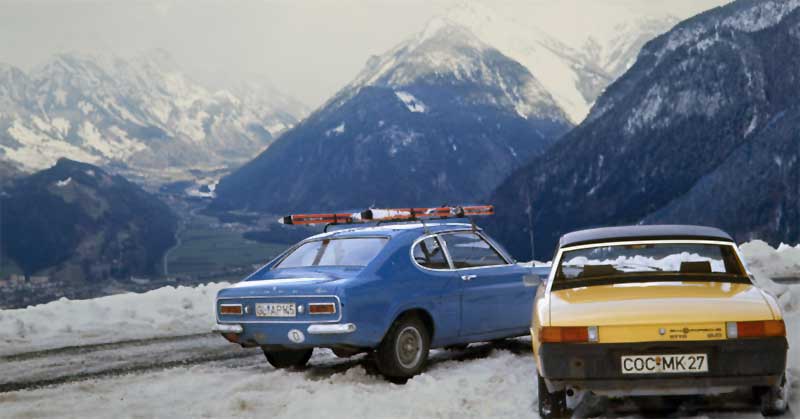 In Vorarlberg hat mein Vater dann eher unfreiwillig bewiesen, dass man auch nur eine Schneekette braucht, um einen sommerbereiften Capri den verschneiten Berg hochzuscheuchen. Es wurde die Frage aufgeworfen: `Warum rutscht der Wagen denn so durch die Kurven?` Merke: Wenn man unterwegs eine Kette verliert, geht das auch nur mit einem Exemplar auf einem Rad. Das haben wir aber erst gemerkt, als wir oben waren. Die zweite Kette hat dann später unser Pensionswirt im Straßengraben gefunden.