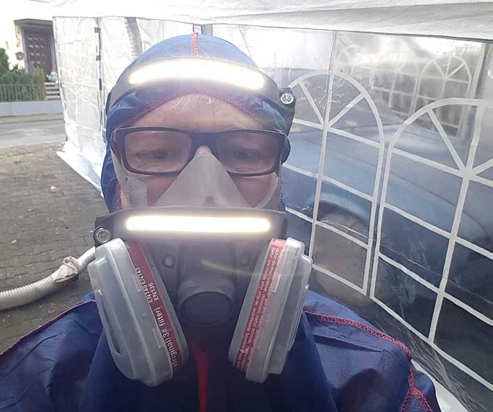 Auch zum 18. Geburtstag meines Sohnes Ole war der Capri noch in der Mache. Im August letzten Jahres war die Karosserie dann endlich fertig geschweißt. Die Lackierung mit Basislack in Paris Blue Metallic erwies sich als besondere Herausforderung. Dafür habe ich ein Zelt als provisorische Lackierkabine aufgebaut. Leider gelang das unter diesen Umständen nicht fehlerfrei. Aber kein Kunstwerk ist letztendlich perfekt.